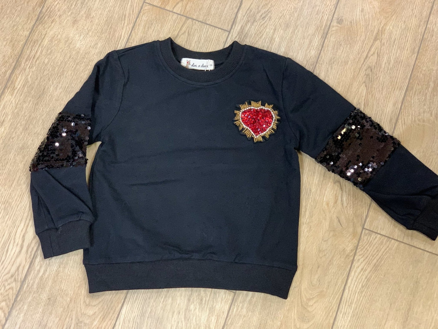 Black Sweatshirt with sequin heart appliqué on the front and thick a sequin stripe on the sleeves.