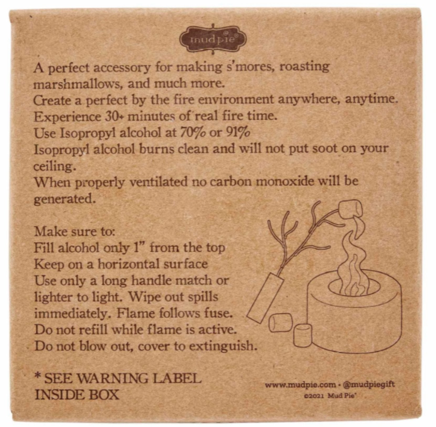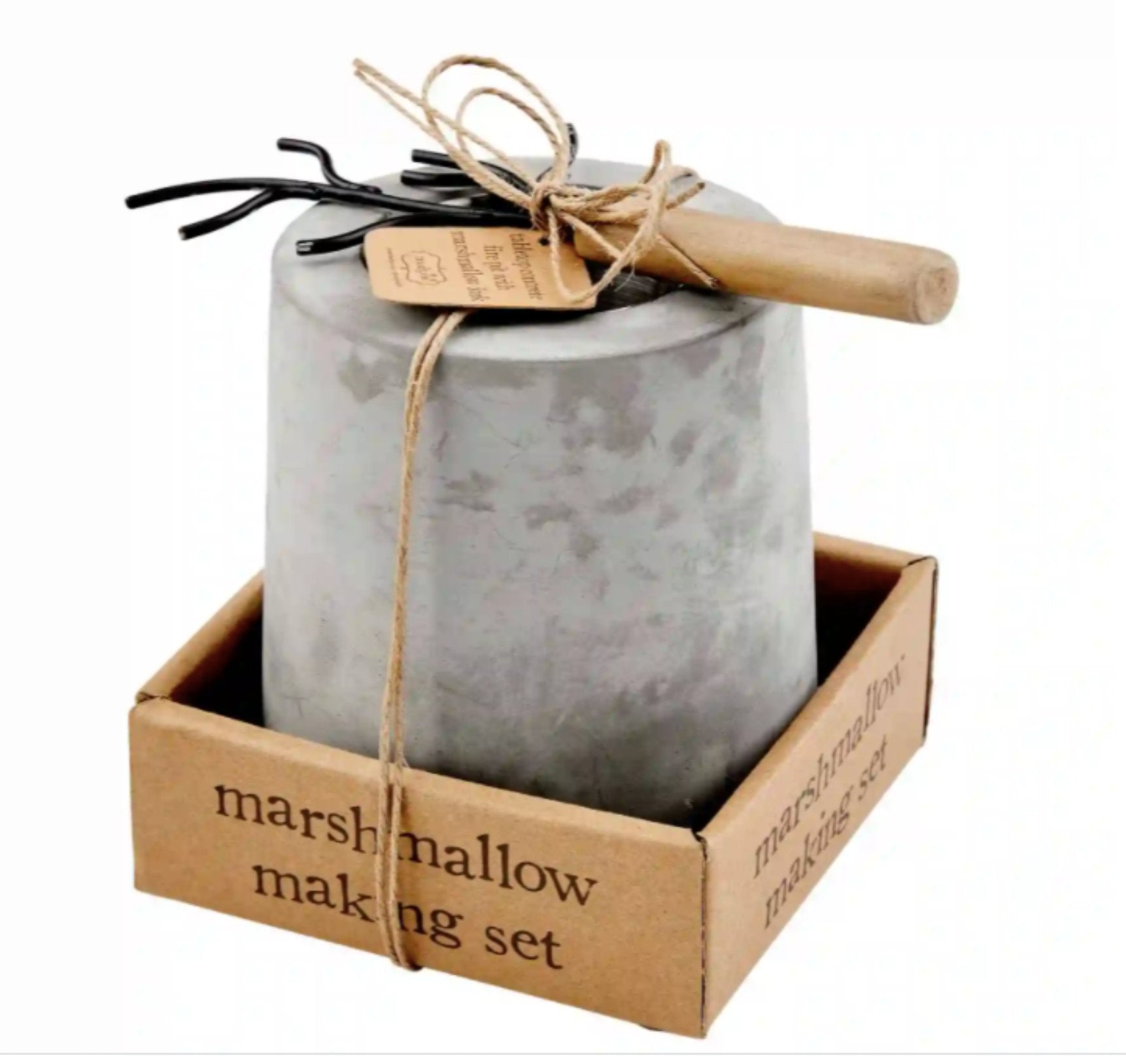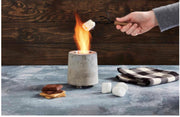 This marshmallow roasting set is the perfect accessory for making s'mores, roasting marshmallows, and more. This two-piece set comes with a concrete tabletop mini fire pit and wood and a metal wire roasting skewer.
