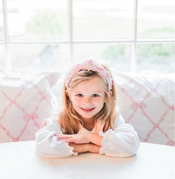 RESTOCKED! The No Bow No Go headband is a favorite that sells out fast! Each side features cute bows and beading on a pink top knot headband. Child size but can also fit most adults. Poppyland headbands are kids' favorite headbands.