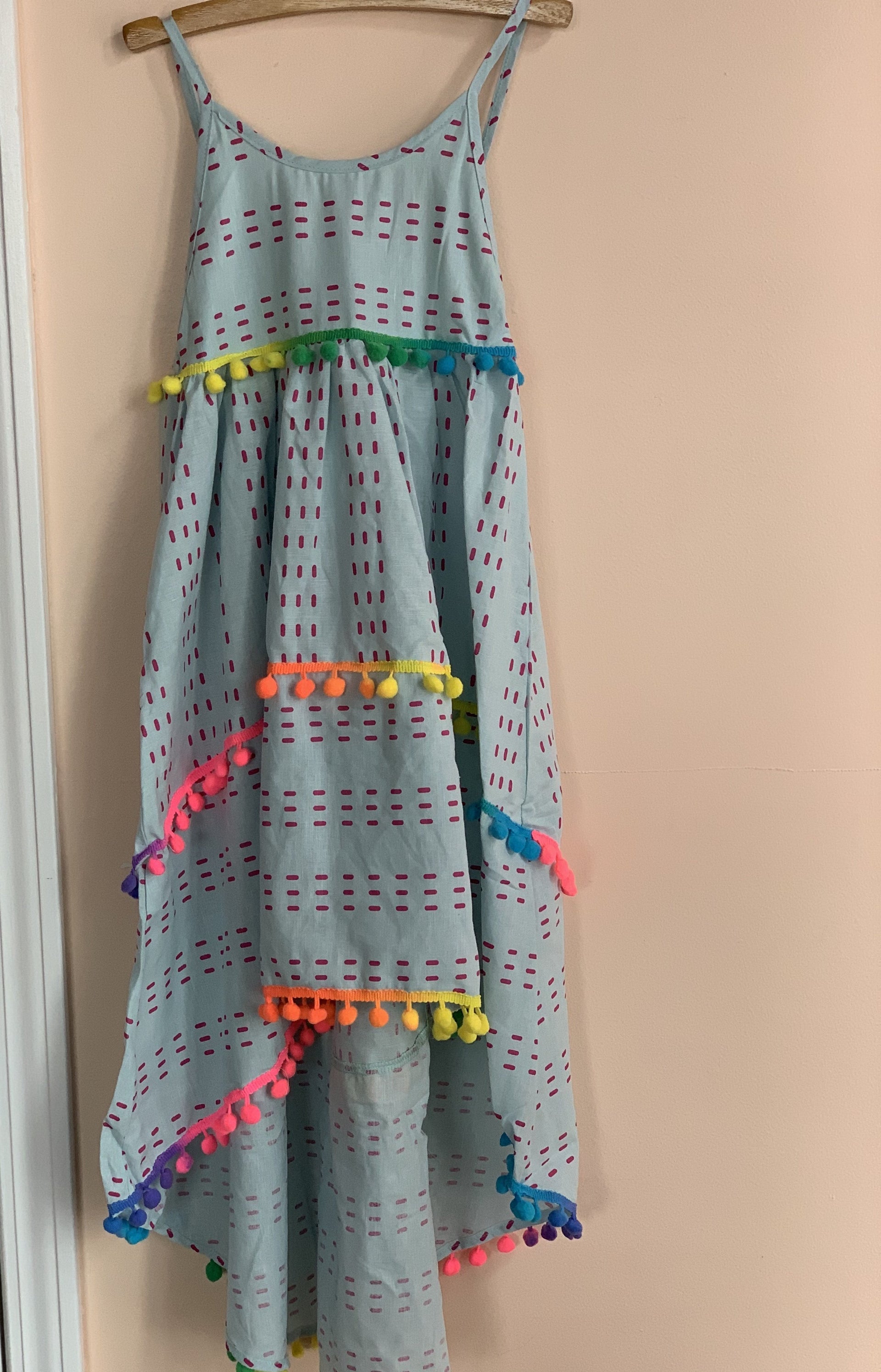 A pretty colorful high low sun dress decorated with colorful pom poms. adjustable straps.