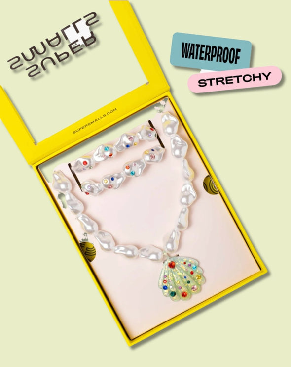 Experience the enchanting life of a mermaid with our Mermaid Pool Party Mega Set! Made for both land and sea adventures, this set was created by our Kid-in-Chief Luna, who wanted to capture the sparkling beauty of these mystical creatures. Featuring "freshwater pearls" and a gem-covered sea shell, every detail is designed for comfort and durability. So dive in, dance in, and let your mermaid dreams come true with this magical summery set!
