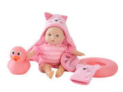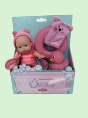 This adorable 8" waterproof doll is just right for a trip to the beach or bathtime play. The Splash and Play™ Cuties are fully submersible and float! Hang up to drip dry after play. Each doll comes with a wash mitt, hooded towel, floaty ring and duck toy