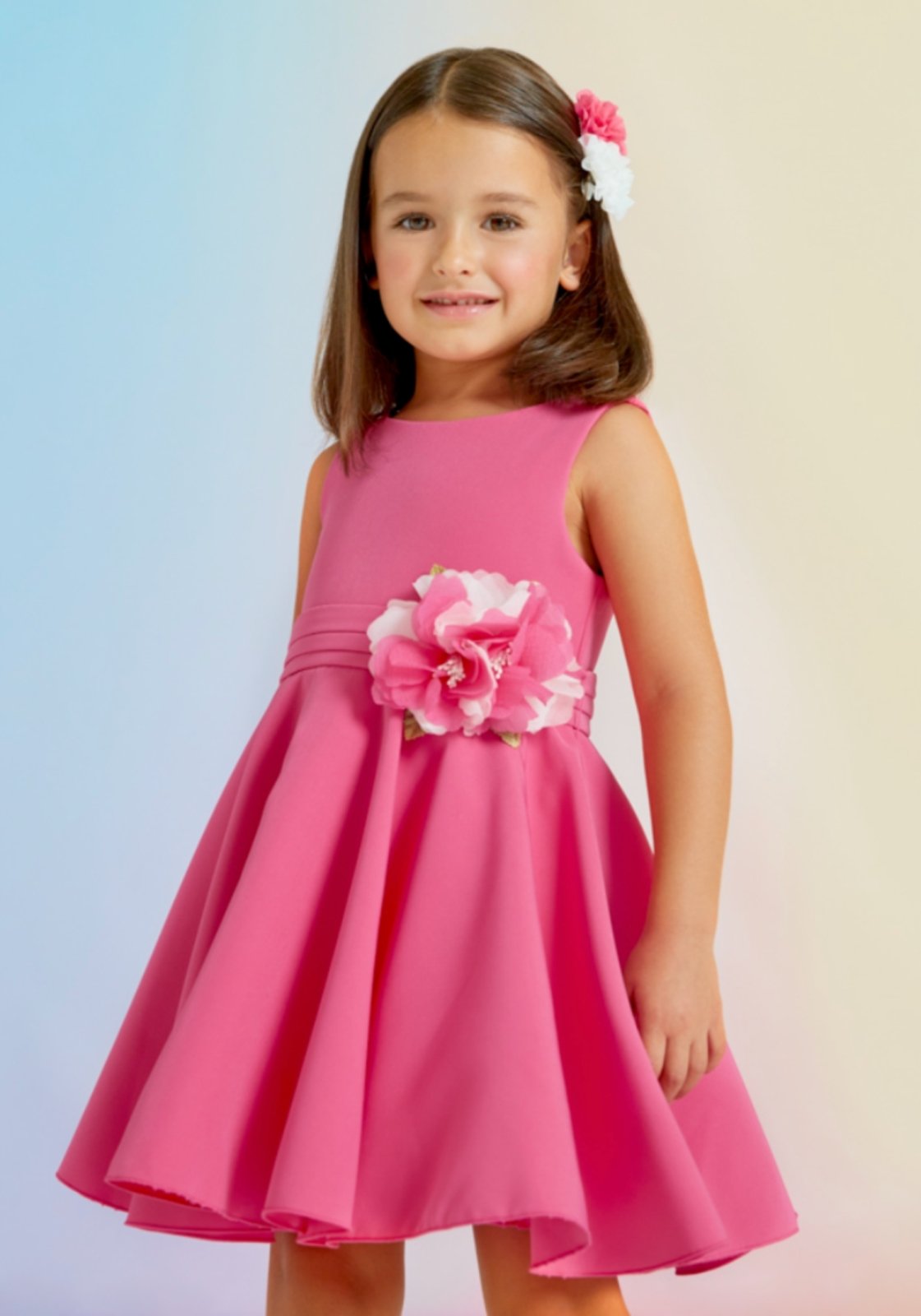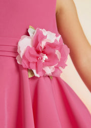 A beautiful sleeveless dress in a strawberry color. Belt with big flower attachment, Scoop opening back. Concealed zipper back. An ideal look to wear on any special occasion.