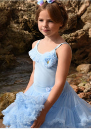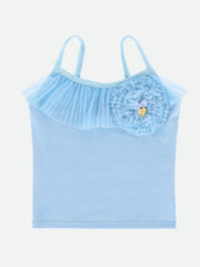 Girls very pretty Patrice cotton jersey vest in soft, baby blue. Cropped to sit above the waist, it has thin straps, a feminine frilled collar around the neckline and on the front is a soft tulle rosette finished with our signature bow and gold heart charm. A capsule wardrobe essential for the season, it's colour matched to co-ordinate with our collection.