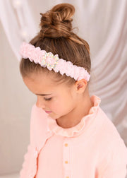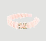 NEW For Spring 2025. This stunning peach headband for girls is adorned with a sparkle-inducing diamanté buckle. Made of flexible material and accented with ruffled layers of tulle, it adds a touch of drama to any Angel's Face ensemble. Clean easily with a simple wipe. Elevate your look with the perfect finishing touch. 100% Polyester construction.