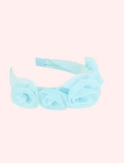 NEW For 2025! Indulge in a touch of luxury with our aqua tulle headband, perfect for elevating any outfit. Adorned with three delicate roses, this headband flatters the face and adds a stylish flair to your look. Crafted from high-quality materials, including 95% cotton and 100% nylon, it offers both comfort and elegance. Keep it clean with a simple wipe.