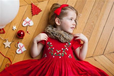 Hand-made white & green holly embroidery on red,short assembles balloons sleeves hand smock dress.. 100% Cotton. Double Layers. One of our most romantic pieces!