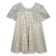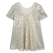 A elegant and stylish gold sequin A-line dress for special events. Lightweight with short sleeves. Fully lined. Scoop back.