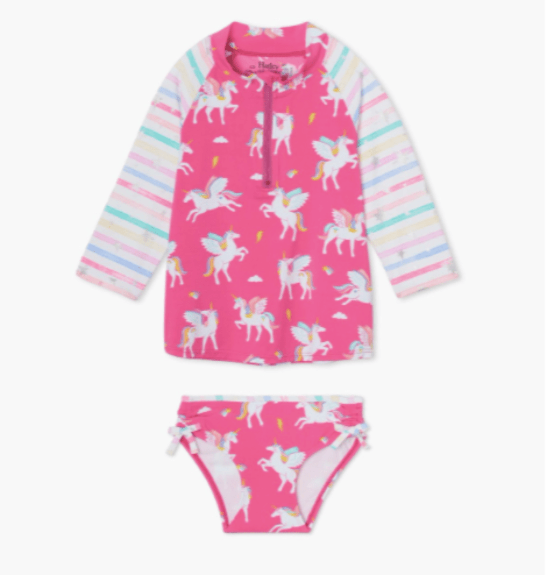 The ultimate protection from the sun, surf and wind, the long sleeve rashguard set with a zippered front is a must! Featuring playful pineapple designs and ruching and bow details on the bottoms, it's summer ready, mom-approved and loved by kids.