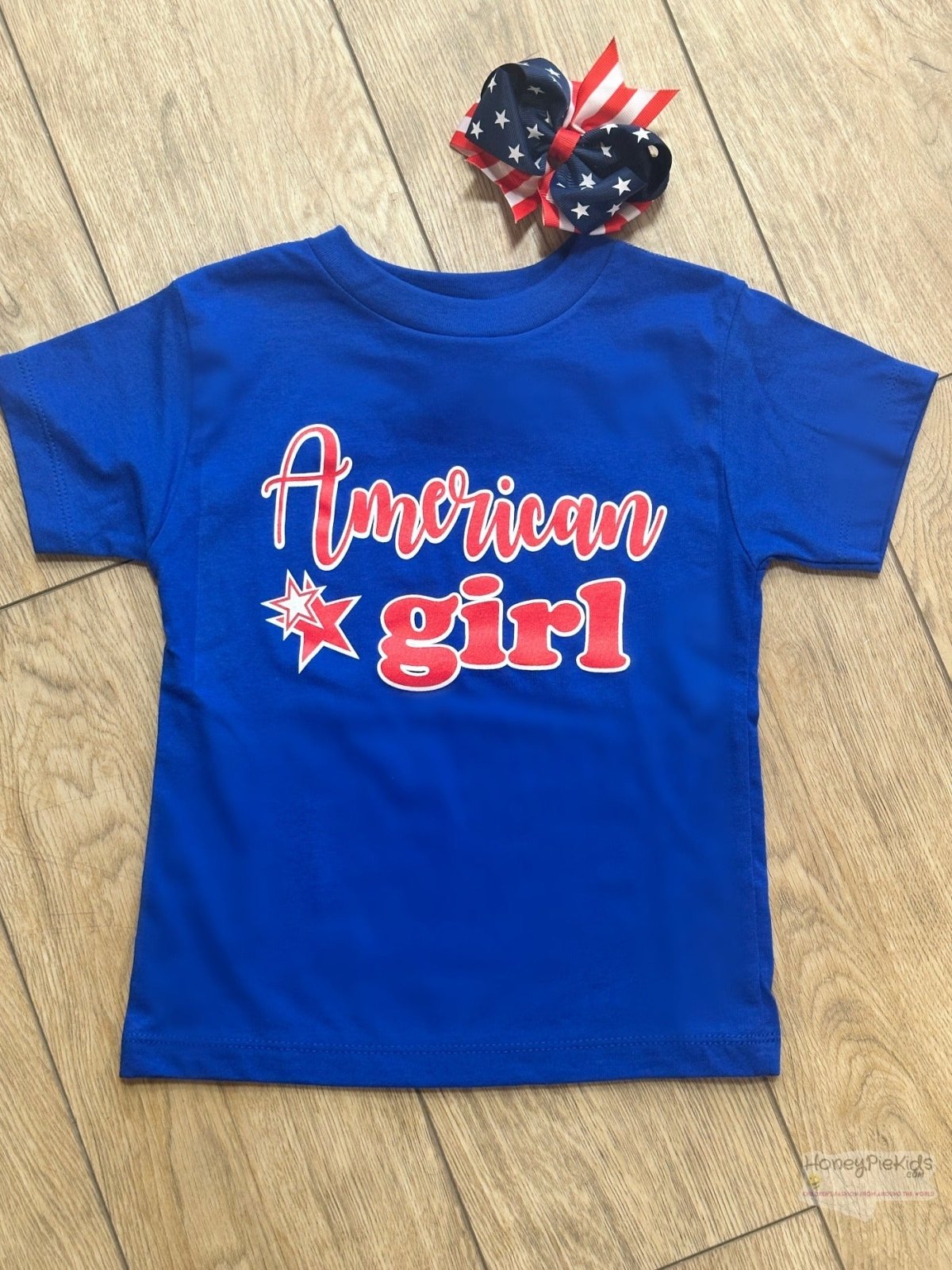 A cute American Girl royal blue t-shirt professionally screen printed on a super soft kids tee made of 100% ring spun cotton.