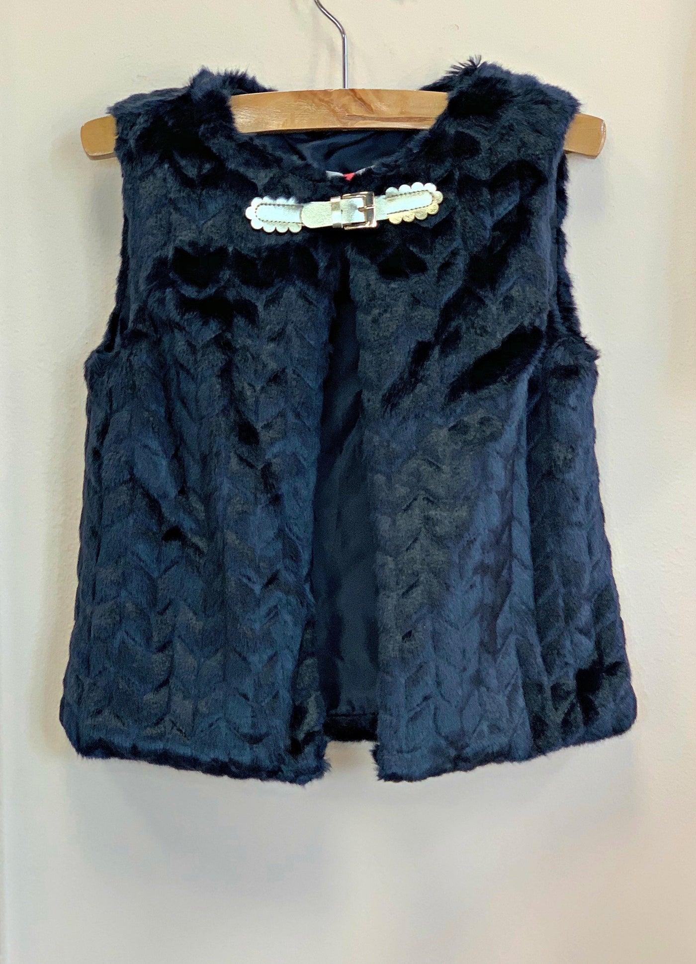 Lili Gaufrette a pretty faux fur Loyd vest with a metal gold buckle closure. Synthetic lining, Sleeveless, Hook on the collar,