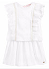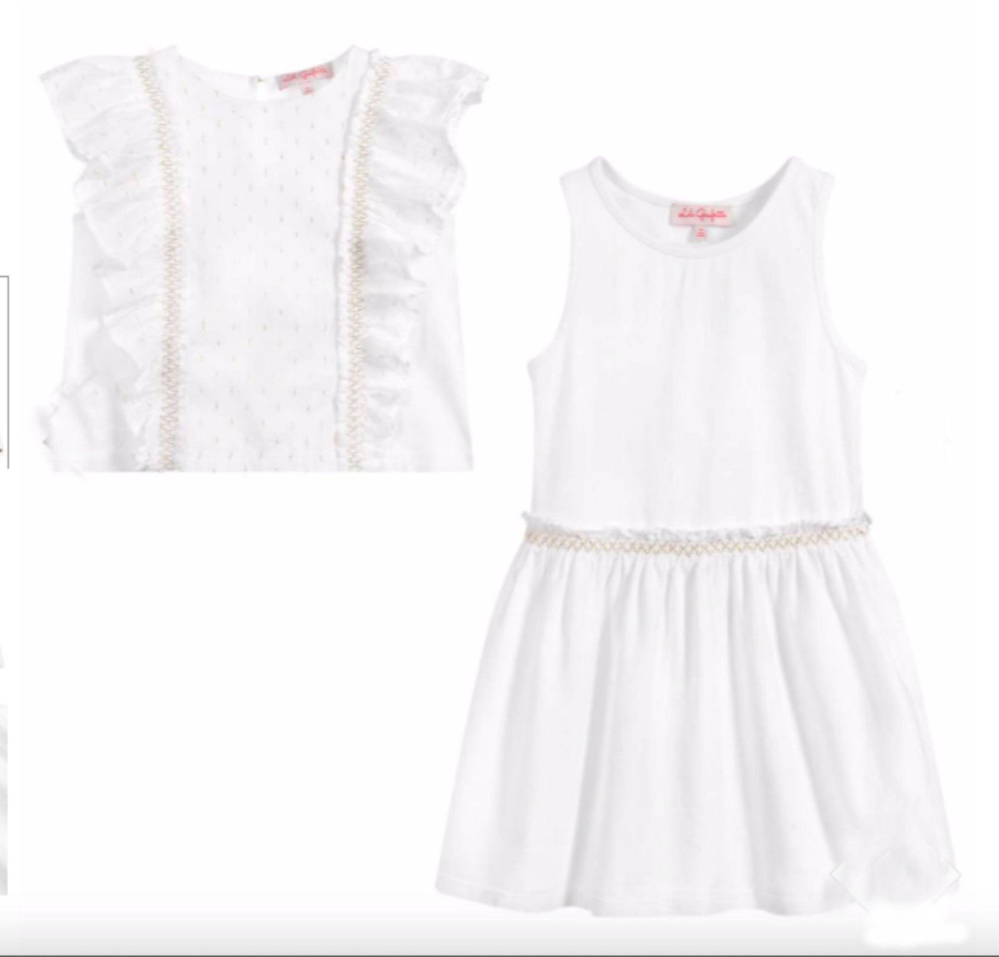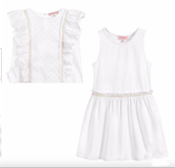 NEW! Lili Gaufrette White cotton 2 piece dress set with gold embroidered trim and detail. Has a removable top that can be worn over the dress or alone.