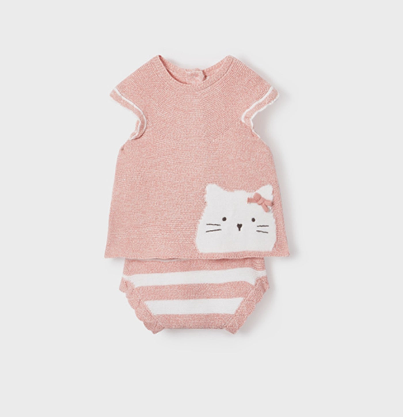 Set is packaged in a Mayoral box, perfect for gift giving. Includes a beautiful baby knit sleeveless top with a cute cat and bow on the front and pink and white striped knit bottoms. The top buttons all the way up the back for easy removal.