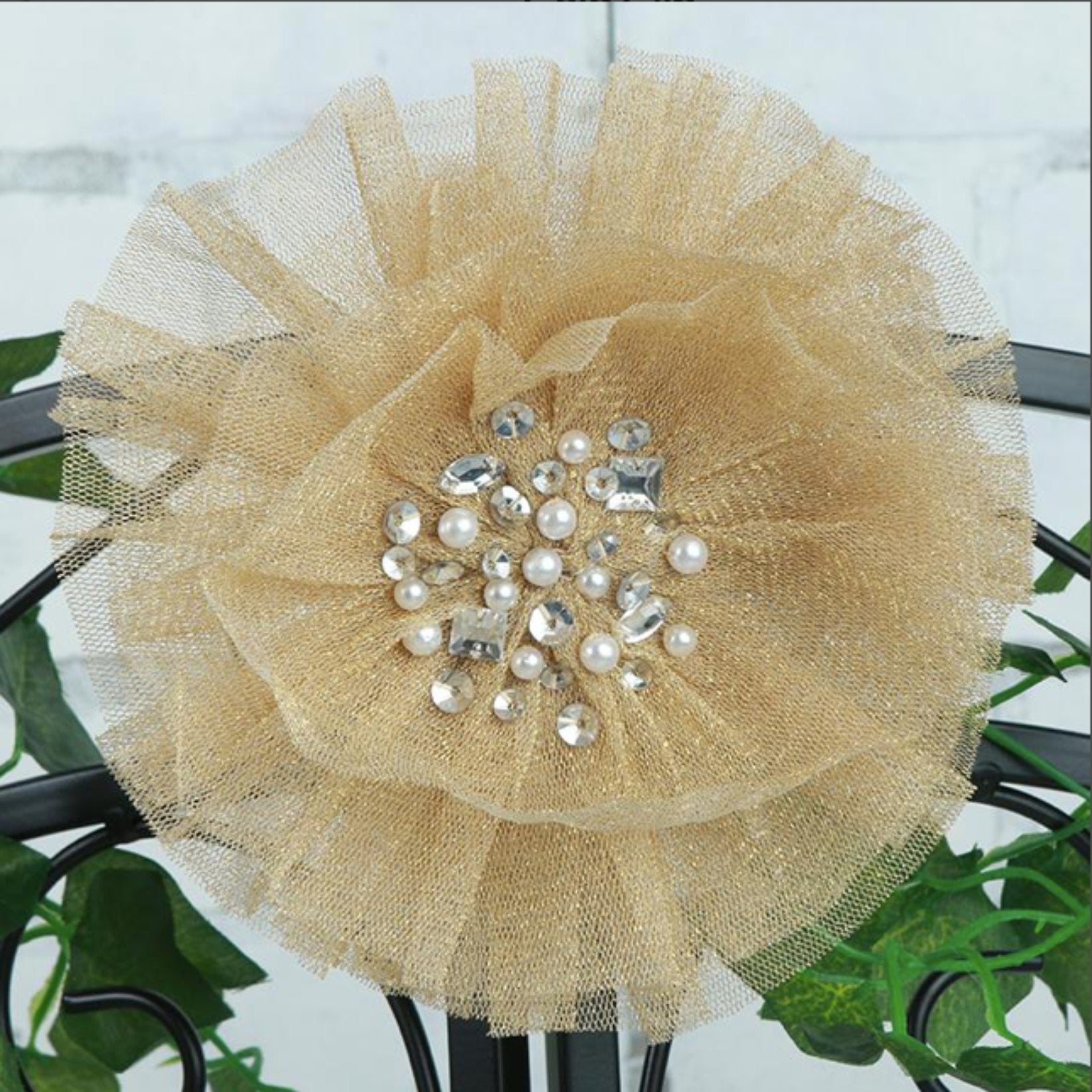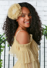 NEW! The Ooh La La Couture! Gold Sparkle Crystals & Pearl Tulle Flower Hair & Strap Clip is beautifully detailed. It can be worn in the hair or on a shoulder strap.