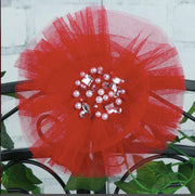 NEW! The Ruby Red Crystals and Pearl Tulle Flower Hair Clip is a charming ruby red tulle hair bow shaped like a full flower with rhinestones and pearls in the center. Can also be clipped to one shoulder of a Ooh La La Couture dress strap for a cute accent.