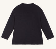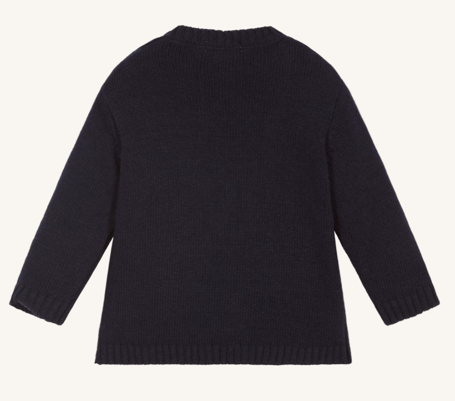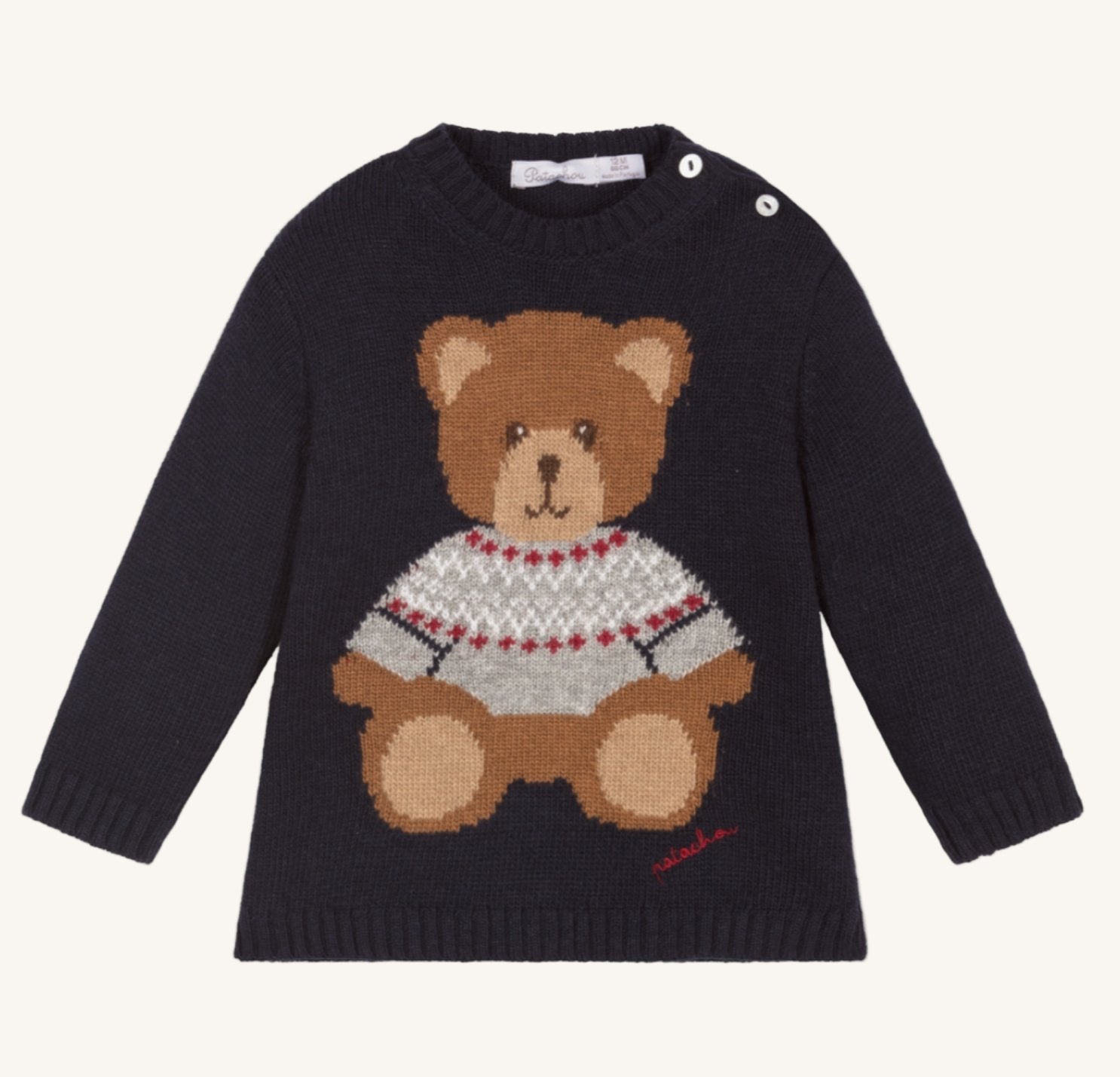 A "beary" cute classic and polished navy knit sweater for baby and toddler boys. A soft knit blend of viscose, merino wool, and cashmere. Featuring a cute Teddy Bear wearing a sweater on the front. Fastening with shoulder buttons, and embroidered red Patachou logo on the front.