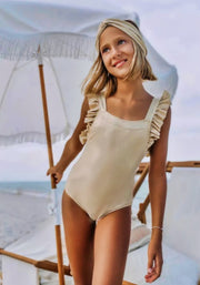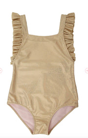 An exquisite one piece gold glitter swimsuit with ruffle shoulders. Crafted from exquisitely gentle UPF50+ fabric, The fabric is not only gentle on your child's skin, but also shields it from 99.8% of harmful UV rays. Enjoy optimal sun protection with our luxurious one piece swimsuit. WE SUGGEST SIZING UP ONE SIZE IN THIS BRAND