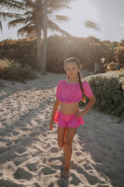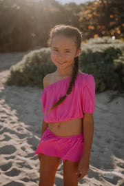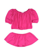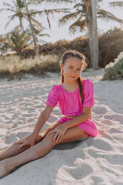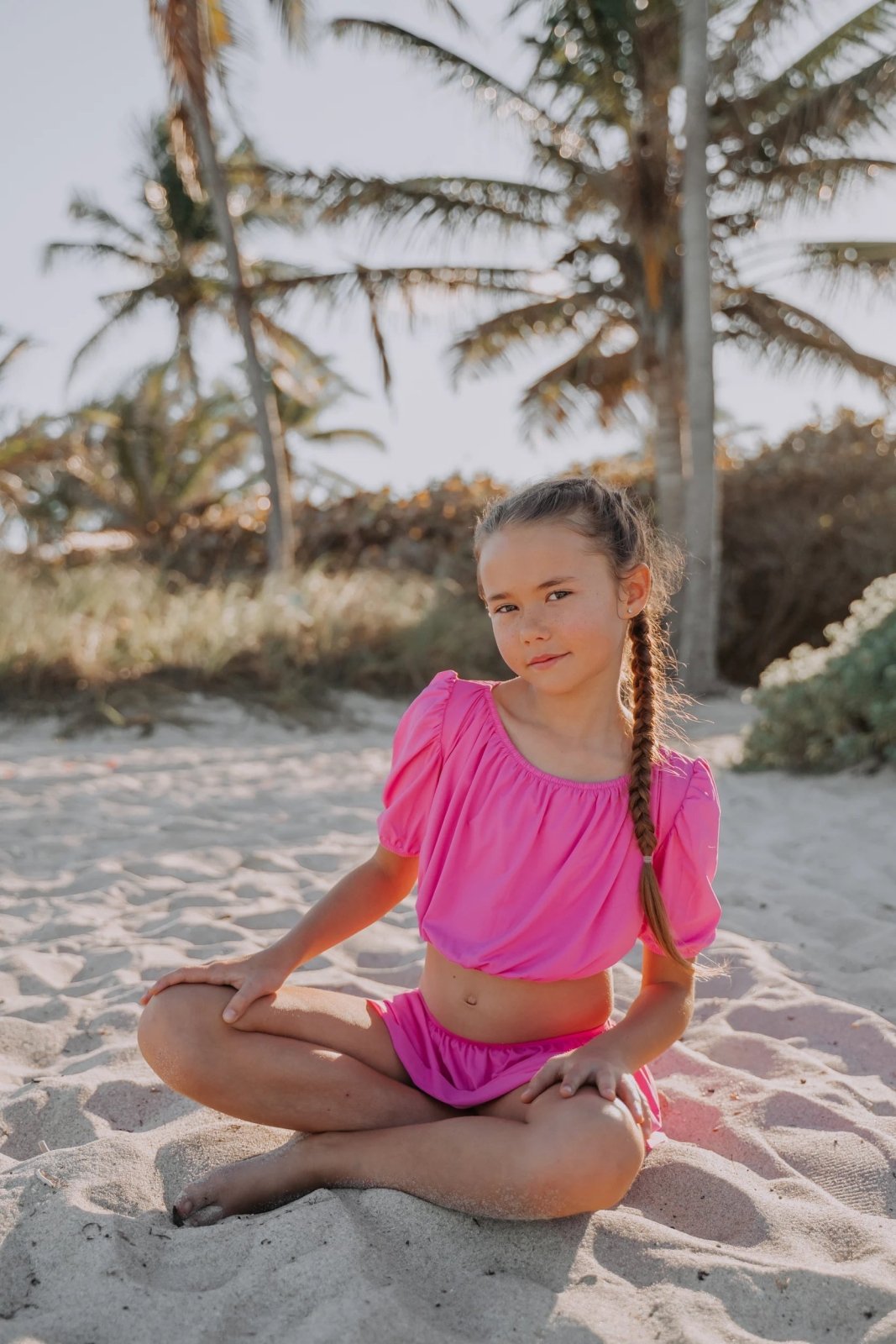 Make a bold statement this summer with the Hot Pink Virginia Bougainvillea Skirted Two-Piece Swimsuit, a luxury kids' swimsuit designed for stylish little trendsetters. This high-end designer swimsuit features a unique puff-shoulder top with a relaxed fit, paired with an elegant skirted bikini bottom in a stunning solid hot pink shade. Perfect for vacations, the pool, or beach. this Italian boutique swimwear exudes timeless sophistication and playful charm.