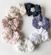 Ruffled Headband fits newborn to approximately 4 years. Embellished with a pearl cluster to add the perfect amount of glitz! This stretchy, soft, and cute headband is a customer favorite!
