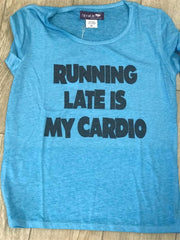 Running Late Is My Cardio Shirt, short sleeve t shirt made by Sparkle by Stoopher. cap sleeve shirt-tail style.