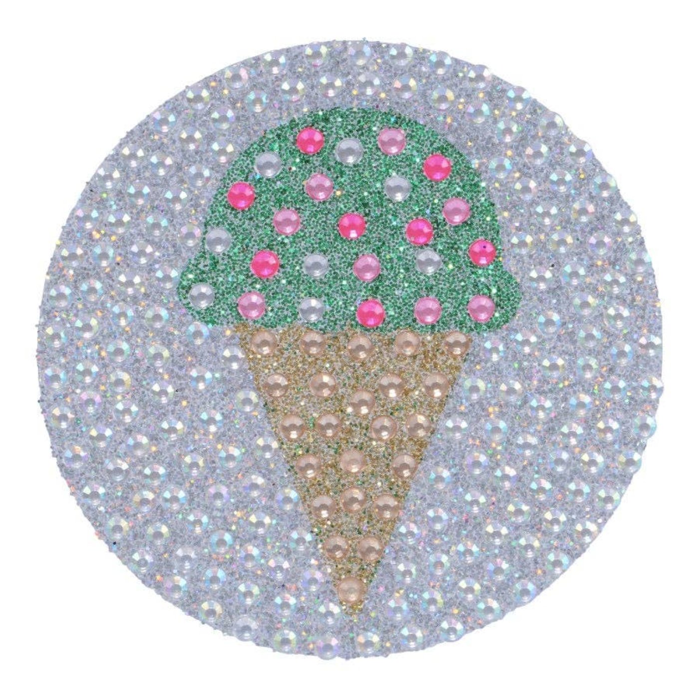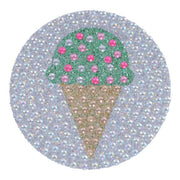 The Rhinestone Ice Cream Cone Sticker is: 2 inches by 2 inches, Cut to shape, Adhesive backing. Sparkly stickers that are fun for kids to put on their lockers, folders, cell phones, mirrors, and almost anywhere.
