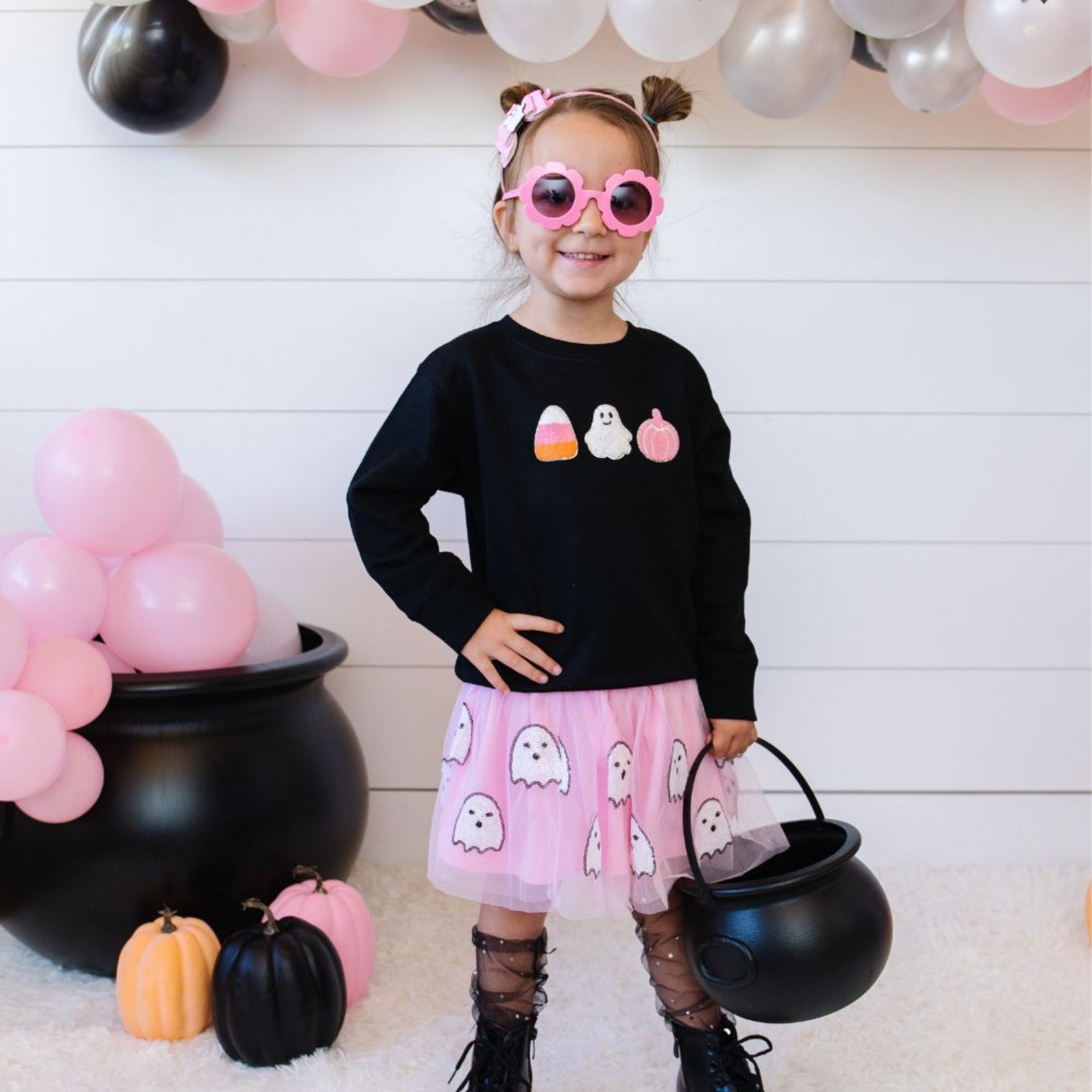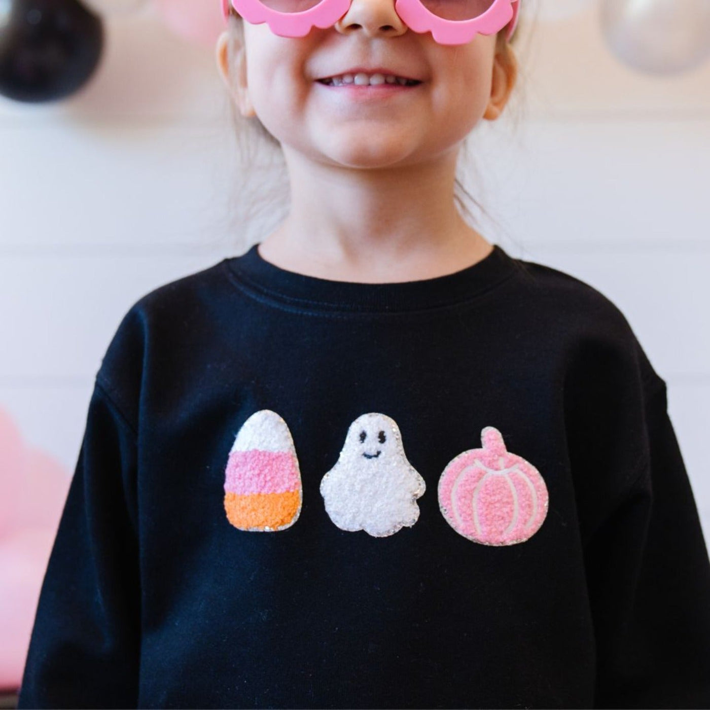 The Girls Halloween Treats Patch Sweatshirt in Black with cute treats patches. This tagless sweatshirt is great for girls celebrating the spooky season with style.
