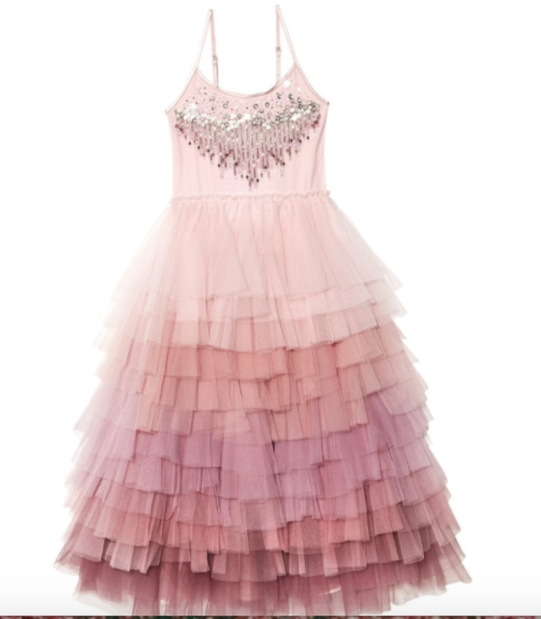 A multi-layered skirt falls in dramatic ombré layers in a silhouette that is dramatically daring. There are adjustable straps, an elasticated waistband, plus a soft cotton lining for added comfort and ease of wear.