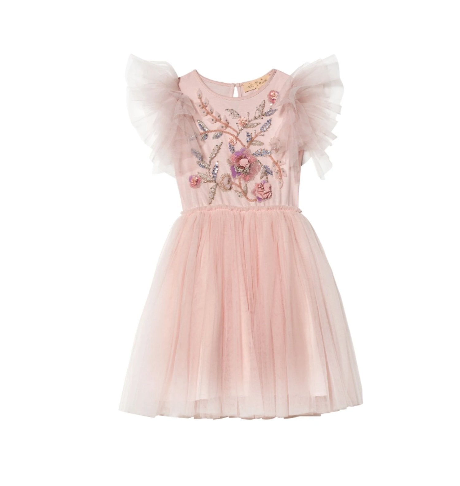 Inspired by the beauty of delicate blooms, the Grace Tutu Dress is ethereal, elegant, and enchanting. This stunning piece is bold and breezy, featuring a striking applique of sequins and beads nestled among the delicate Porcelain Pink tulle ruffles that decorate the bodice and neckline. A full tulle skirt falls from the waistline, while delicately pleated cap sleeves complete the stunning look.