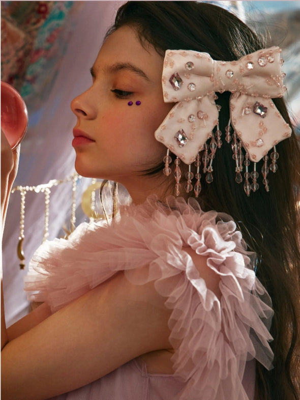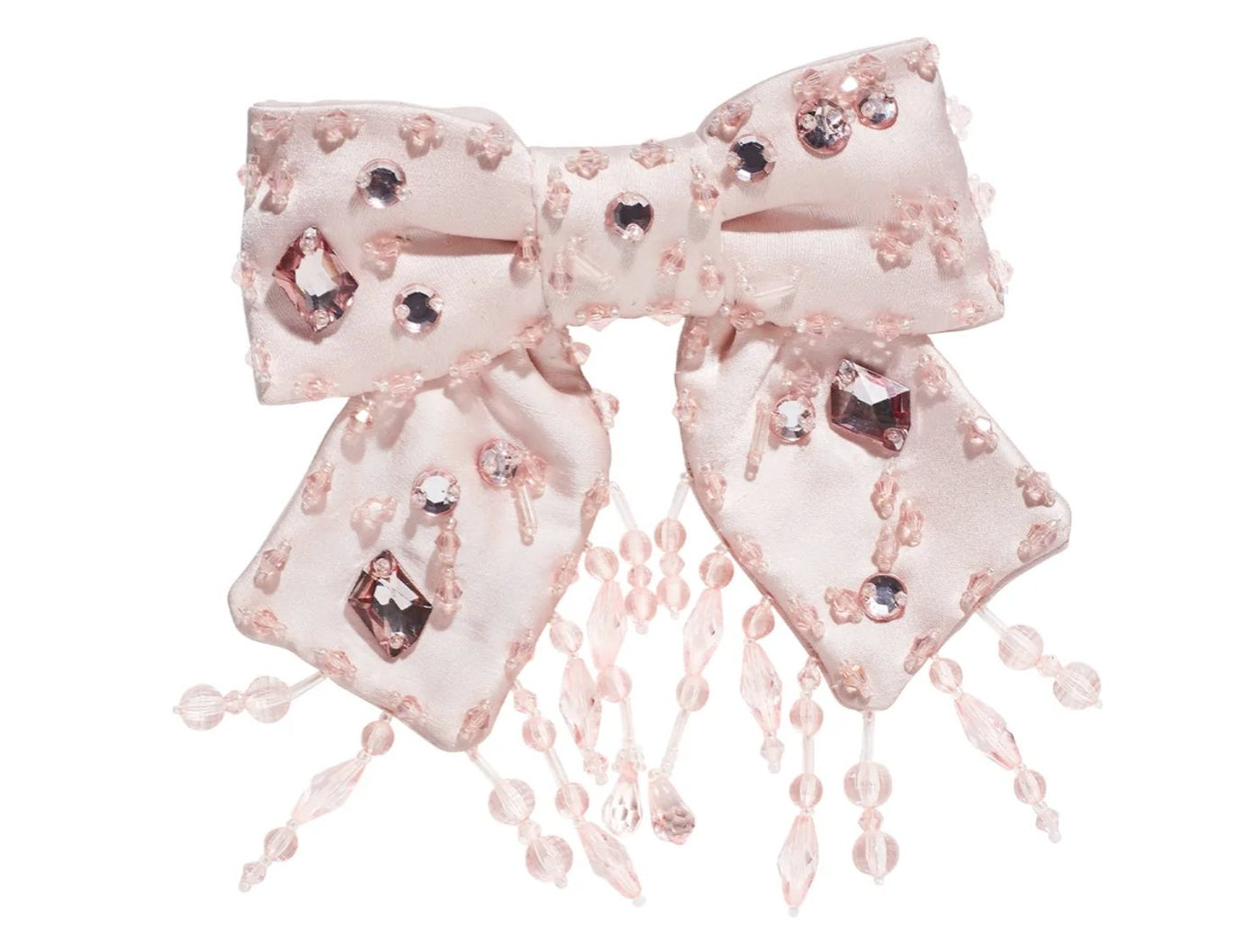 Make her dreams come true with the Crystal Dream Hair Clip! This oversized fabric bow is adorned with hand-applied embellishments in the form of chunky crystals, sequins, and strings of dangling beads for that extra razzle-dazzle.